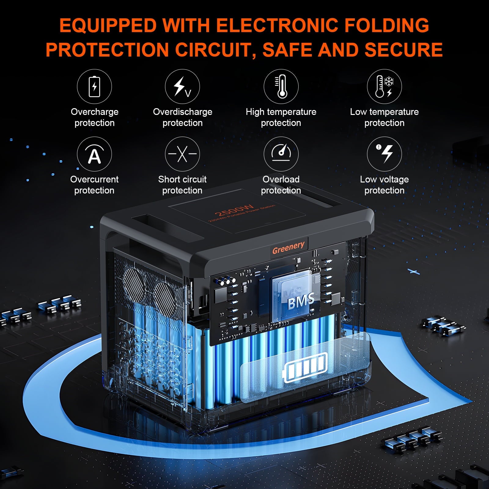 Stay powered on any adventure with the Greenery Portable Power Station G2500. Featuring a massive 2304Wh capacity and 2500W output, this reliable power station can run microwaves, refrigerators, CPAP machines, and more—perfect for camping, outdoor recording, or off-grid use. Enjoy ultra-fast 1.5-hour charging with dual AC and solar input, plus 14 versatile ports to charge multiple devices simultaneously. Its water-resistant, silent design makes it ideal for outdoor trips. Included is a 200W solar panel for clean, renewable energy. The Greenery solar generator is your ultimate solution for long camping trips, emergencies, and outdoor power needs.