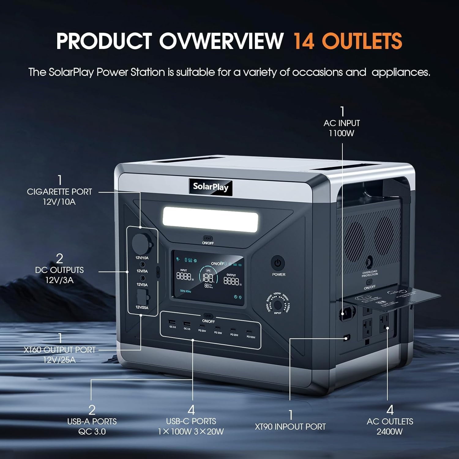 SolarPlay Q2501 2400W 2160Wh Portable Power Station with 200W Solar Panel, 1.5H Fast Charge Generator for Home Use, Camping, RV, Emergency Power